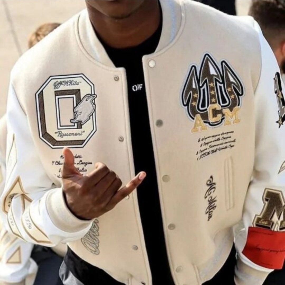 The AC-Milan Off-White Football Varsity Bomber Jacket is a trendy jacket inspired by the famous football club. It's made of strong and comfy materials like silky viscose lining and wool. The jacket has cool leather sleeves, a rib-knit collar, and easy snap-tab buttons. What makes it special is the club crest on the left chest, showing your love for the team in a classy style. The jacket is perfect any event such as casual and formal gathering, travel, party etc.